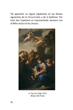 Tal aparición se siguió repitiendo en las fiestas siguientes de la Circuncisión y de la Epifanía. Por esto San Cayetano es representado siempre con el Niño Jesús en los brazos. A. Vaccaro (Siglo XVII) Museo del Prado 38