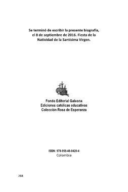 Se terminó de escribir la presente biografía, el 8 de septiembre de 2016. Fiesta de la Natividad de la Santísima Virgen. Fondo Editorial Galeona Ediciones católicas educativas Colección Rosa de Esperanza ISBN: 978-958-48-0420-4 Colombia 288